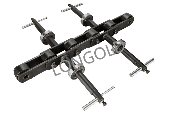 除去特殊的A2附件外,為保證運(yùn)輸?shù)姆€(wěn)定性,這款鏈條還帶有可以起到導(dǎo)向作用和載荷分擔(dān)作用的導(dǎo)輪。
