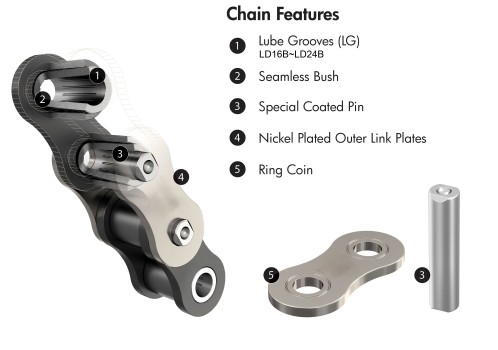 · LD16B及以下尺寸的連接鏈節(jié)是開(kāi)口銷(xiāo)型,而對(duì)于LD20B到LD2B尺寸則是開(kāi)口銷(xiāo)類(lèi)型。 · 可以根據(jù)要求提供額外尺寸、多排鏈條以及帶特殊附件的鈦鏈條 |