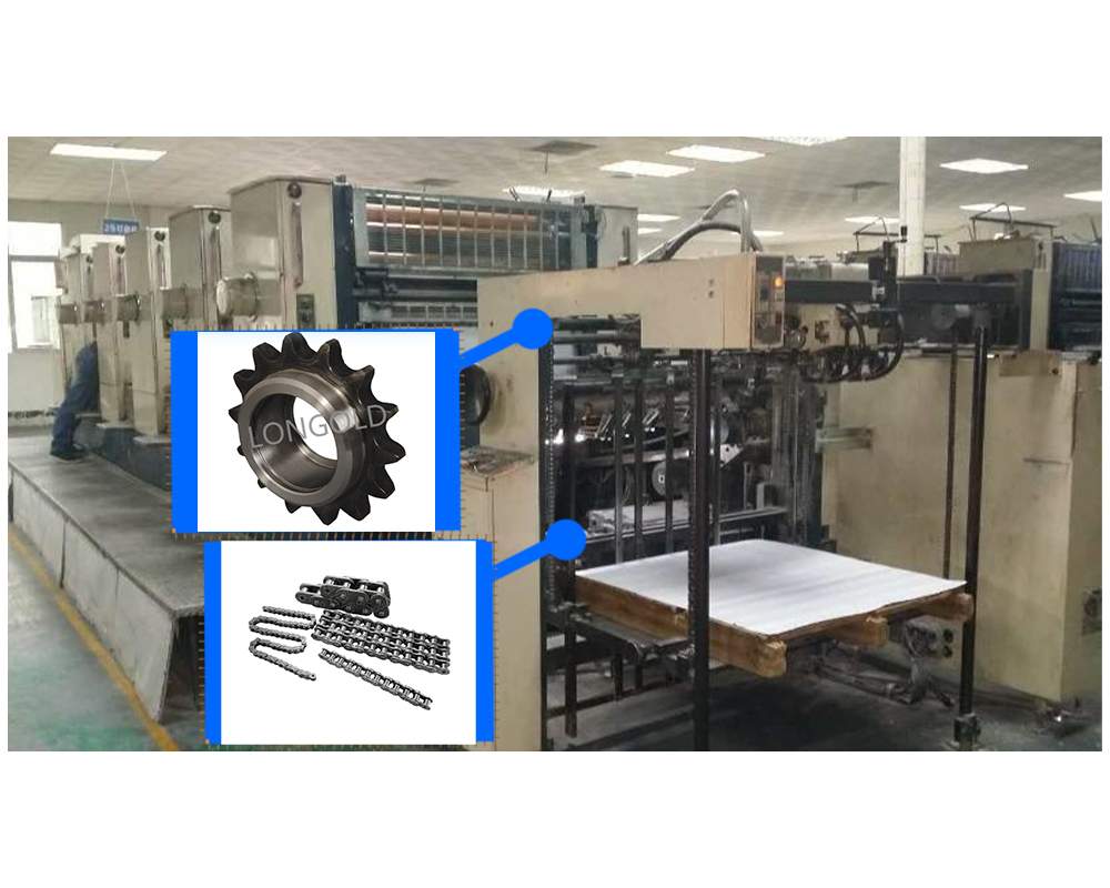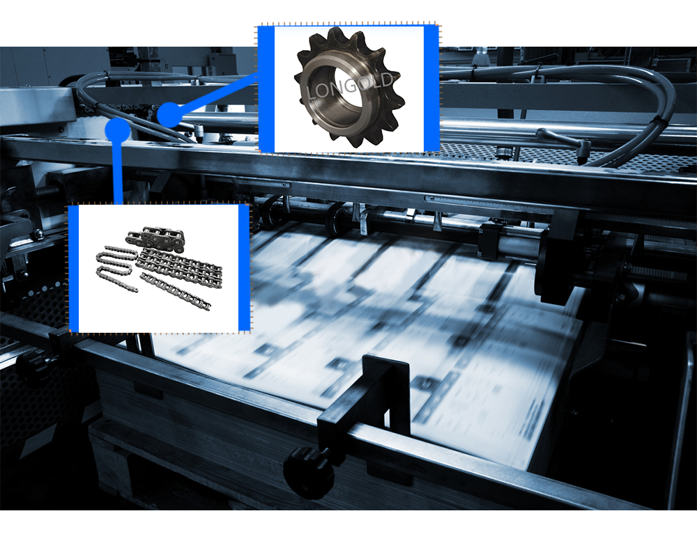 印刷設(shè)備通常需要較大的動力來驅(qū)動各個(gè)部件的運(yùn)動,隆德的傳動鏈和鏈輪可以將動力從電機(jī)等動力源傳遞到印刷設(shè)備的各個(gè)部位,確保設(shè)備的正常運(yùn)行。圖中為滾子鏈和鏈輪組合來為印刷設(shè)備傳動動力。 |