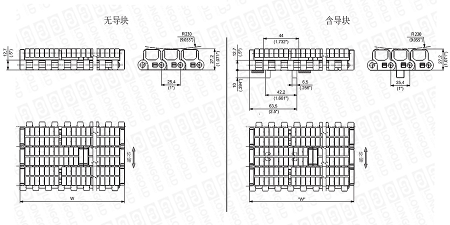上圖為1"節(jié)距重載網(wǎng)帶與鏈板 LBP USPM系列系列,圖紙中已標明部分尺寸。