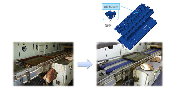 應(yīng)用前,因托盤的油份或底面的凹凸,托盤易在頂板鏈上滑動,導(dǎo)致輸送頻繁停止。 使用鏈條內(nèi)部嵌入磁鐵的塑料頂板鏈條后,磁鐵的磁力吸住托盤,使托盤不再滑動。 |
